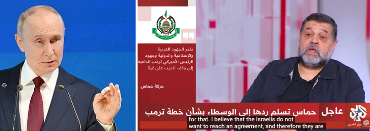 This was amplified in a detailed response to the Trump plan in a 21-minute interview broadcast by Al-Arabiya [6], the Saudi state television channel based in Riyadh. Osama Hamdan (lead image, right), a veteran Palestinian diplomat, advisor to and spokesman for Hamas, answered each of Putin’s questions, and more.Watch and if need be, turn on the English auto-translate function at the Youtube setting [7].