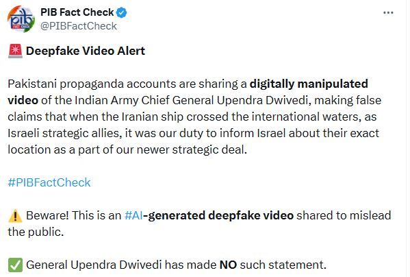 This report [23] has been denied by the Indian government as an AI fabrication composed in Pakistan and circulated in Turkey.    The evidence in matching the two circulating videos confirms Dwivedi did not discuss the Dena sinking  or India’s military relationship with Israel during the interview as originally recorded [24].