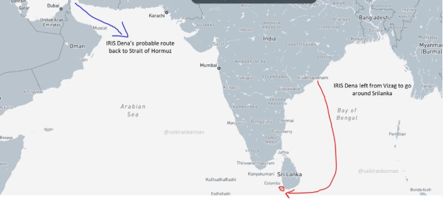 A map of the position of the IRIS Dena when sunk on March 4. According to subsequent comments by Indian officials, the Dena was accompanied out of Visakhapatnam by the IRIS Lavan  and the IRIS Bushehr but no official or credible map of their voyage south has been published.