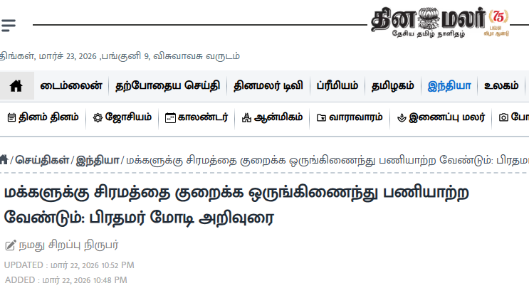 In a Tamil Nadu newspaper report of yesterday, Modi’s war against Iran is presented as an “inconvenience”. The headline reads: “PM Modi advises people to work together to reduce inconvenience to people”. Source: https://www.dinamalar.com/news/india-tamil-news/we-need-to-work-together-to-reduce-hardships-for-the-people-pm-modi-advises/4179956 [36]