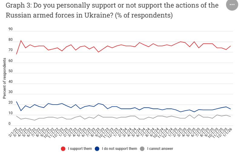 In a related report of the same polling results, Levada has revealed [4]: “The majority of Russians, 61%, believe that it is necessary now to move to peace talks, but over the past month [December 2025 poll] their share has decreased by five percentage points. At the same time, the share of those who think it is necessary to continue military operations has increased to a third of respondents (31%, an increase of 6 percentage points)…The majority of respondents (59%) believe that if achieving  peace with Ukraine is not yet possible, Russia should escalate its strikes on Ukraine, including using new types of weapons.”