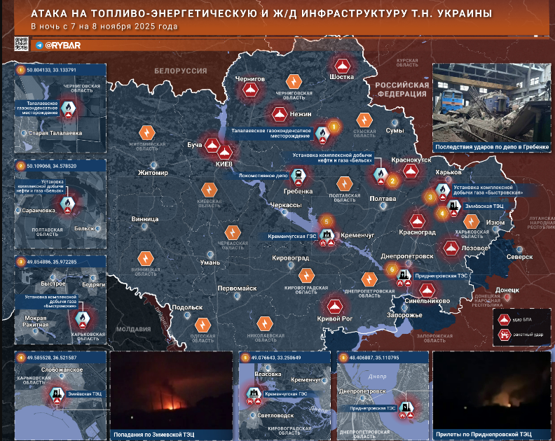 In itemizing the targets on the map, Mikhail Zvinchuk, chief of the Rybar military blog, reported that “Ukrainian sources stated that the night raid on gas production and processing facilities was the largest since the start of the special military operation. This is indirectly confirmed by the estimated number of munitions fired. The gas infrastructure in the east…has already been the target of massive attacks multiple times and has suffered significant damage. Therefore, it is quite likely that the consequences of the new raid could indeed be very severe for the enemy. It is also worth noting that the Russian Armed Forces have concentrated on sensitive nodes of electricity generation and transit of the enemy. On November 8, the state company Centrenergo announced the shutdown of all thermal power plants in the country.”