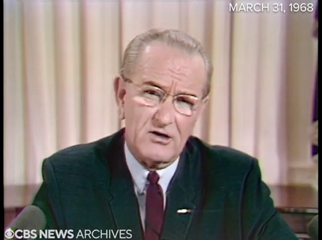 President Johnson’s  announcement of his withdrawal from the presidential election campaign was made on March 31, 1968. In the preceding polling of that month, US voter approval for Johnson had fallen to 36% and disapproval had risen to 52%; these were the worst poll results for Johnson since he had become president in 1963. https://www.presidency.ucsb.edu/statistics/data/lyndon-b-johnson-public-approval [19] Johnson calculated he would lose the re-election campaign because of the rising Vietnam War casualties  and the inflation rate which had jumped from 3.1% in 1967 to 4.2% for 1968.  https://www.in2013dollars.com/inflation-rate-in-1968#:~:text=Inflation%20in%201968%20and%20its,Statistics%20to%20officially%20determine%20inflation [20]. Source: https://www.youtube.com/watch?v=D9gddYDbhV4 [21] “Tonight,” Johnson said, “I have ordered our aircraft and our naval vessels to make no attacks on North Vietnam, except in the area north of the demilitarized zone where the continuing enemy buildup directly threatens allied forward positions and where the movements of their troops and supplies are clearly related to that threat.The area in which we are stopping our attacks includes almost 90 percent of North Vietnam’s population, and most of its territory. Thus there will be no attacks around the principal populated areas, or in the food-producing areas of North Vietnam. Even this very limited bombing of the North could come to an early end—if our restraint is matched by restraint in Hanoi. But I cannot in good conscience stop all bombing so long as to do so would immediately and directly endanger the lives of our men and our allies. Whether a complete bombing halt becomes possible in the future will be determined by events. Our purpose in this action is to bring about a reduction in the level of violence that now exists… in these times as in times before, it is true that a house divided against itself by the spirit of faction, of party, of region, of religion, of race, is a house that cannot stand. There is division in the American house now, there is divisiveness among us all tonight… I have concluded that I should not permit the Presidency to become involved in the partisan divisions that are developing in this political year. With America’s sons in the fields far away, with America’s future under challenge right here at home, with our hopes and the world’s hopes for peace in the balance every day, I do not believe that I should devote an hour or a day of my time to any personal partisan causes or to any duties other than the awesome duties of this office—the Presidency of your country. Accordingly, I shall not seek, and I will not accept, the nomination of my party for another term as your President.” Full text -- https://www.lbjlibrary.org/object/text/presidents-address-nation-03-31-1968 [22] Background:https://en.wikipedia.org/wiki/Withdrawal_of_Lyndon_B._Johnson_from_the_1968_United_States_presidential_election#:~:text=On%20March%2031%2C%201968%2C%20then,1968%20United%20States%20presidential%20election [23]