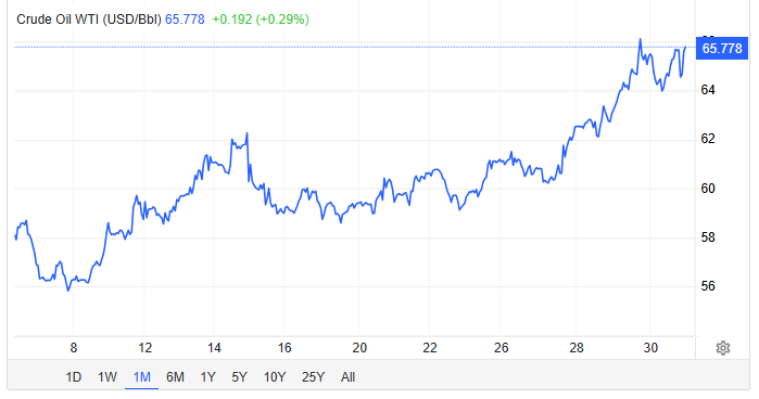 OIL FUTURES MARKET CHART FOR WEST TEXAS INTERMEDIATE (WTI) THIS MONTH – UP 21%