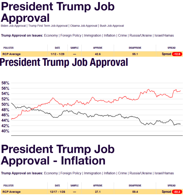 Source: https://www.realclearpolling.com/polls/approval/donald-trump/approval-rating [25] These current charts show that US voter disapproval of Trump’s overall performance has been growing sharply during January,  and that disapproval of his policies on  controlling inflation is double the overall rate. The trend lines, as explained to Trump by his White House pollsters, indicate widespread and growing fear that Trump’s warmaking in Venezuela and in the Middle East will trigger a sharp rise in inflation by the summer. The current US inflation rate is 2.7% annual. This represents a drop caused by last autumn’s reductions in gasoline and fuel oil prices [26].