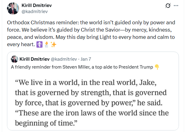There is no evidence of the conversations between Ushakov, Dmitriev, Witkoff, and Kushner when they met in Paris on January 7, or when they have spoken since then by telephone. There is no nothing in the record which Dmitriev is making daily on Twitter that he has requested to know from Witkoff and Kushner what Trump’s intention is to strike, kidnap or kill Putin if Putin fails to accept Trump’s end-of-war terms that Dmitriev is publicly advocating Putin should accept.