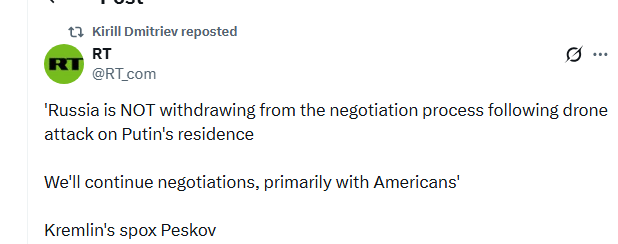 Dmitriev has omitted to say anything himself on the Novgorod and tanker attacks – except to repost the reassurance from Kremlin spokesman, Dmitry Peskov: “Russia is NOT withdrawing from the negotiation process following drone attack on Putin’s residence . We’ll continue negotiations, primarily with Americans.” That the Novgorod raid was a message from Trump to Putin that he knows precisely where Putin is at all times, and if necessary, can strike him with precision – this is not a message for back-channel discussion, according to Dmitriev.