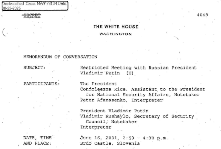 RECORD OF PUTIN-BUSH MEETING, JUNE 16, 2001