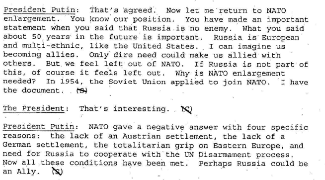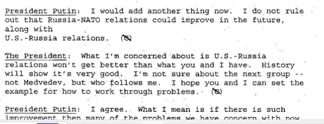 Here is Putin’s elaboration for Bush of the threat of US enlargement of NATO: