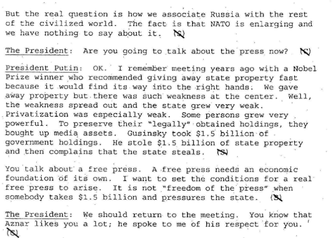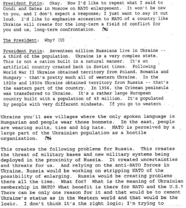 The hitherto secret remarks of Putin are almost identical with what he was saying at the time in public, and what he has subsequently said in opposition to the US plans to make the Ukraine a platform for NATO threats to Russia.