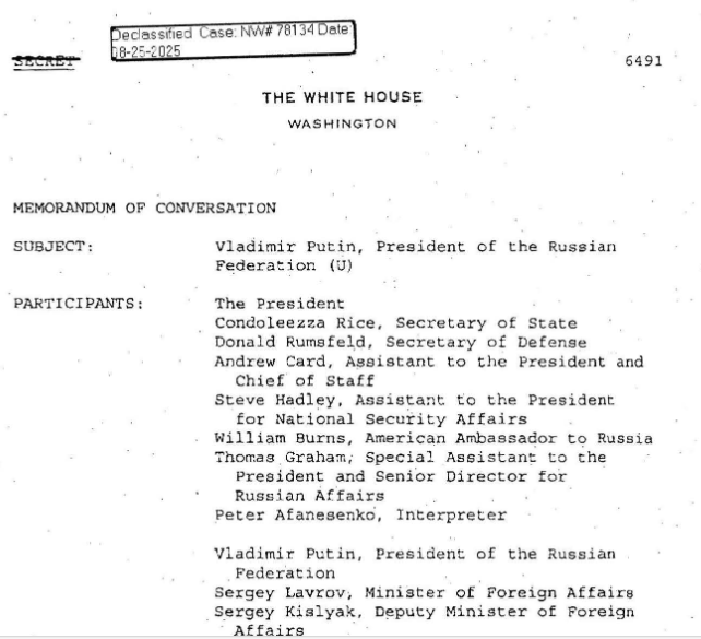 Equally unsurprising is the record that Bush made of his readiness to listen to Putin, and also of his evasiveness and misrepresentation in response – amplified at the time by his Secretary of State Condoleezza Rice and Secretary of Defense Donald Rumsfeld. Although Russian Foreign Minister Sergei Lavrov and Yury Ushakov, then Russian Ambassador to the US, were present at the second and third meetings, the record shows they had less than their counterparts to say – that is, next to nothing.