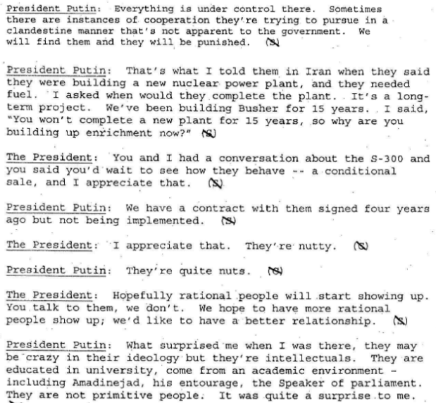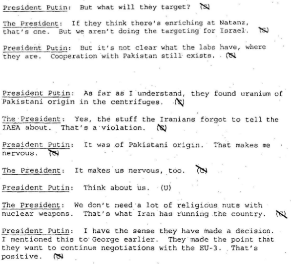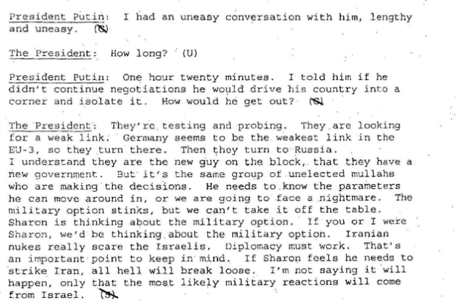 Putin’s response was different when Bush told him Iranian nuclear weapons technology was “scaring” Israel. “The military option stinks,” Bush claimed, referring to Israeli threats to attack Iran’s nuclear enrichment operations. “But we can’t take it off the table. [Israeli Prime Minister Ariel] Sharon is thinking about the military option. If you or I were Sharon, we’d be thinking about the military option. Iranian nukes really scare the Israelis. Diplomacy must work. That’s an important point to keep in mind. If Sharon feels he needs to strike Iran, all hell will break loose. I’m not saying it will happen, only that the most likely military reactions will come from Israel.”