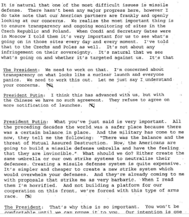 In the third of the declassified presidential records, Putin’s priorities were the new nuclear attack threat which the Bush Administration was developing in their plans to install radar and missile units in the Czech Republic and Poland.