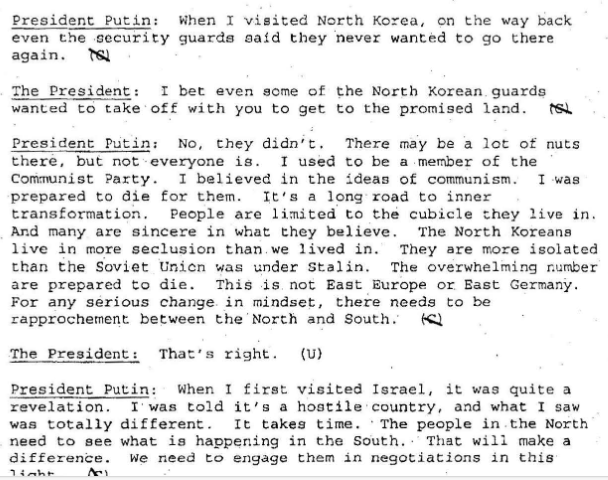 Source: http://en.kremlin.ru/events/president/news/38435 According to the newly released US record, Putin had said “Kim Dae Jung of South Korea visited me this spring. I told him that I don’t trust Kim Jong Il, and I don’t, but there are things that can be done on the Korean Peninsula and the Russia and the United States should cooperate on it.”