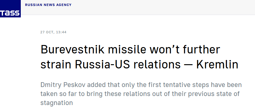 Twenty-four hours later, Putin’s spokesman, Dmitry Peskov, undercut whatever intention Putin had in his Burevestnik disclosure to expose US reluctance to commence the new START talks for which Putin has already announced an extension of time to 2027. According [11] to Peskov, “there is nothing here that could or should further strain relations between Moscow and Washington, especially since they are already at a minimum. So far, only the first tentative steps have been taken to bring these relations out of their previous state of stagnation.”