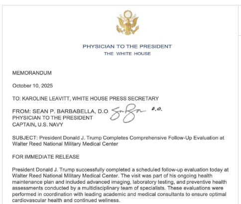 On October 10 the White House issued a memorandum by USN Captain Sean Barbabella, the White House Physician, reporting the results of a 4-hour examination of the President at the Walter Reed National Military Centre.  Barbabella claimed the examination, which included “advanced imaging, laboratory testing, and preventive health assessments”, was “a scheduled follow-up evaluation”.