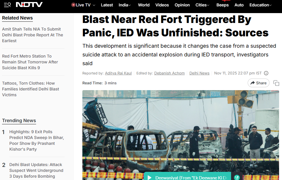 Source: https://www.ndtv.com/delhi-news/blast-near-red-fort-triggered-by-panic-ied-was-incomplete-top-sources-9617063?pfrom=home-ndtv_topscroll This report, published after the podcast had concluded, indicates that the detonation was accidental and followed panic by JeM members after the Indian security services had surprised them in arrests and capture of large caches of arms and explosives in the hours preceding the Monday attack.