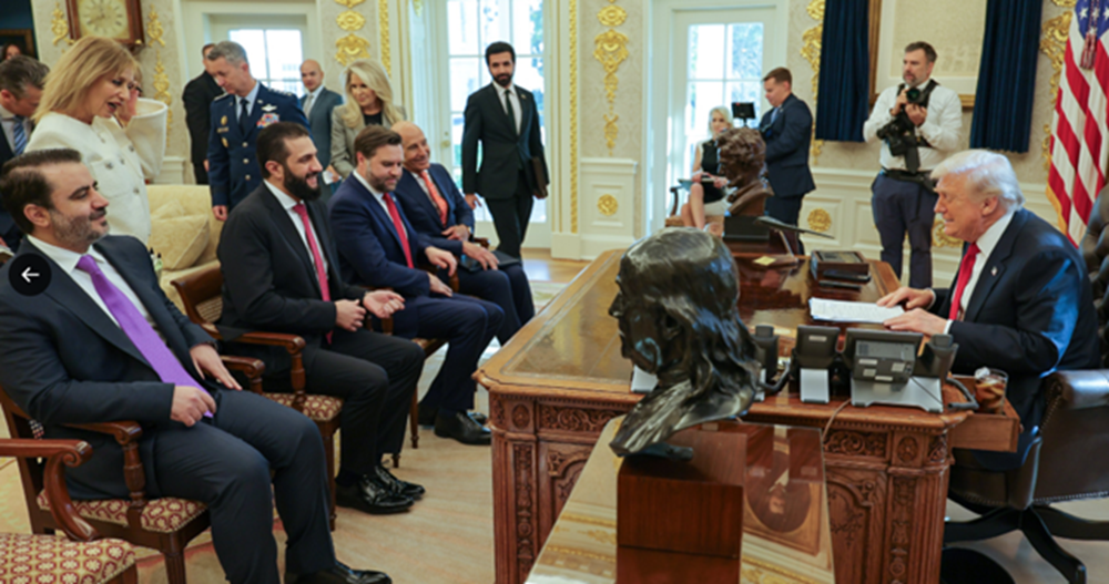The White House took exceptional care to minimize and conceal the trappings of the meetings Al-Jolani and Al-Shaibani had with Trump, Rubio, and US military leaders. There was no Trump welcome at White House portico; no press gaggle in the Oval Office; no press conference after; no place-cards on the Cabinet Room table when Trump met with the Syrians after the Oval Office photo op. Note that even for that, Trump was reading from a prepared script. Trump’s tweets followed later after the Syrian presidency had started to transmit its record of what had transpired.