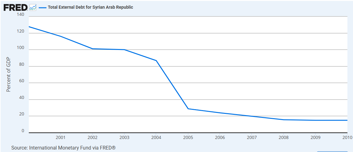 Pre-war: 2008-$5.39B, 2009-$5.69B. The war after Russian intervention: 2021-$5.03B, 2023-$4.88B. Source: https://www.macrotrends.net/datasets/global-metrics/countries/syr/syrian-arab-republic/external-debt-stock