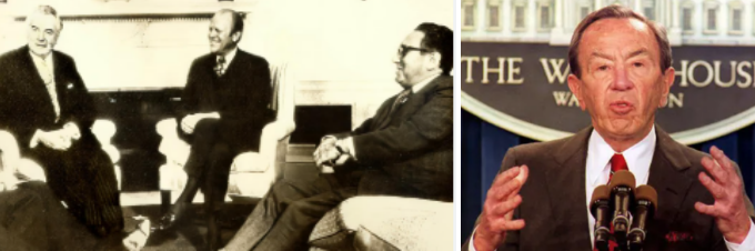 Left image: Prime Minister Whitlam, President Ford, and National Security Advisor Henry Kissinger at the White House, May 7, 1975. Right image: Deputy Secretary of State Warren Christopher in 1977.