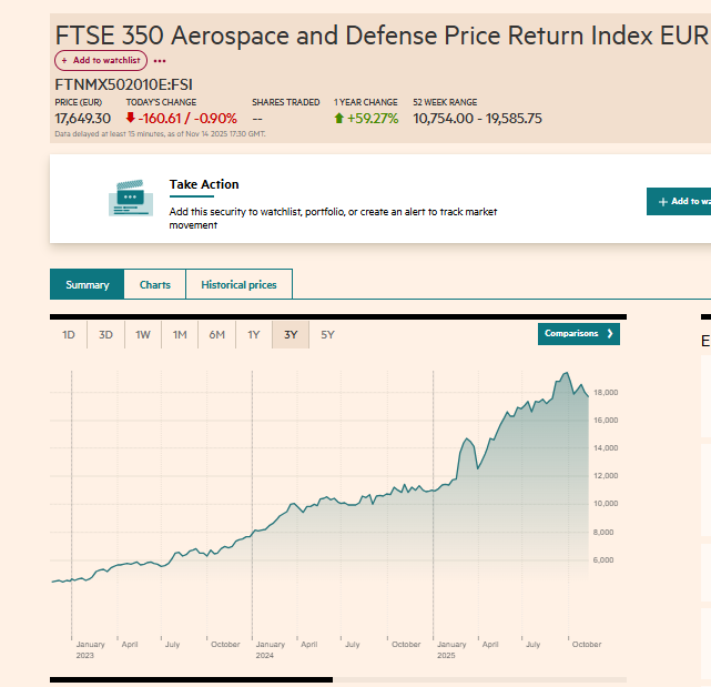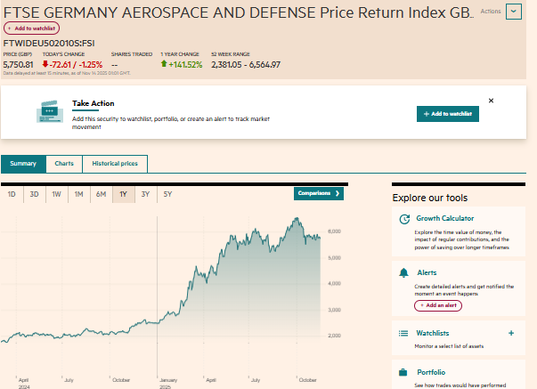 ONE-YEAR RETURN ON THE FT INDEX OF GERMAN DEFENCE SHARES, 142%