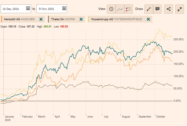 ONE-YEAR SHARE PRICE TRAJECTORIES FOR RHEINMETALL AND OTHER GERMAN ARMS MAKERS