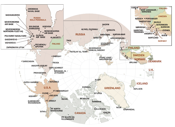 MAP OF RUSSIAN, NATO, US, AND CANADIAN SECURITY AREAS AND BASES IN THE ARCTIC AS OF 2024